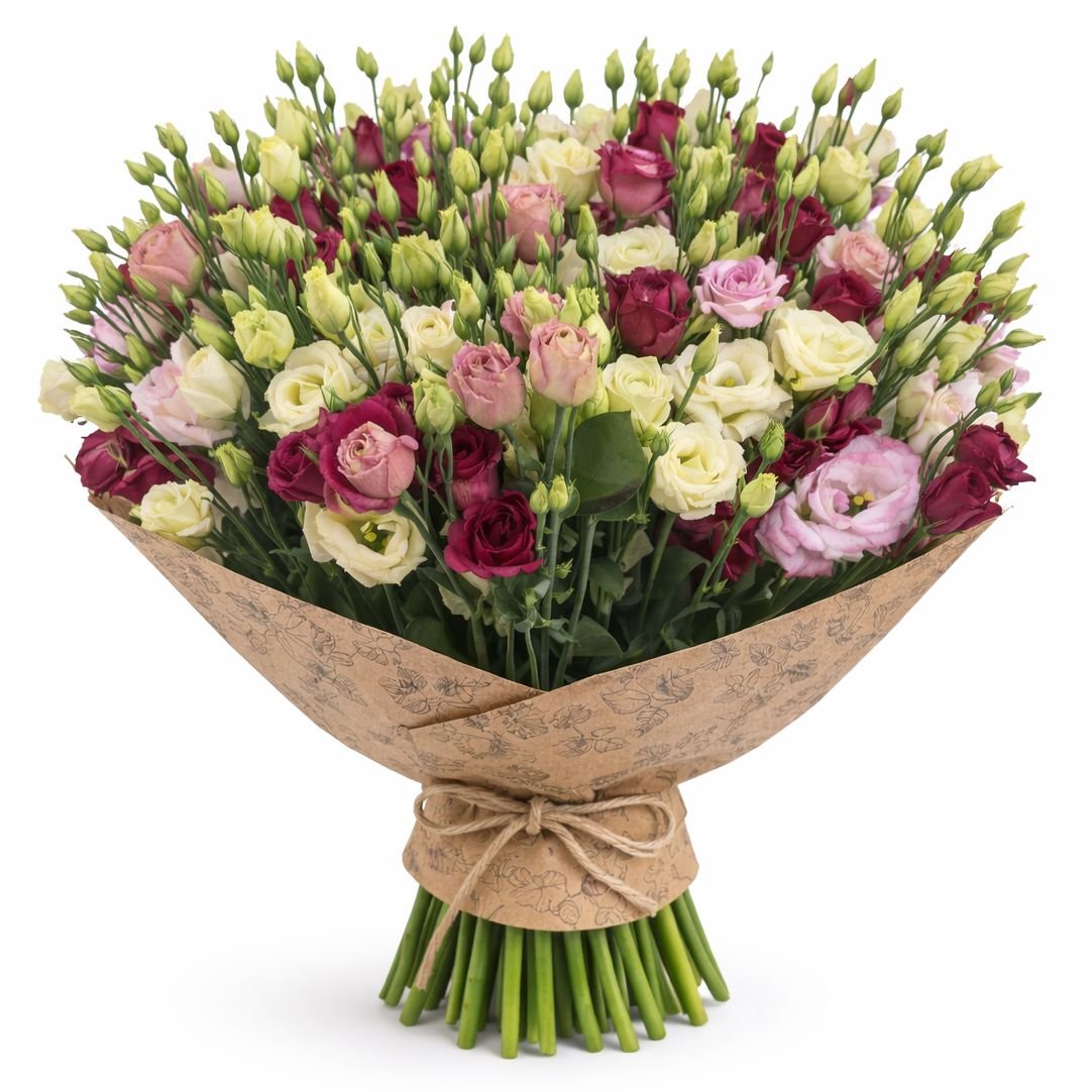 Kytice Eustom v barvách růžová ,bílá a fialová potěší a rozzáří každý den v roce.