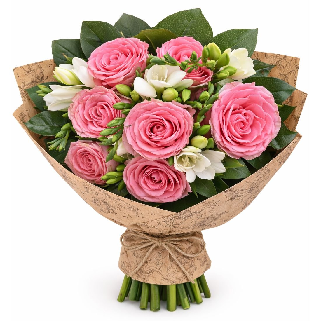 | 7 ks růžové růže, 6 ks frézie a dekorativní zeleň (salal) |