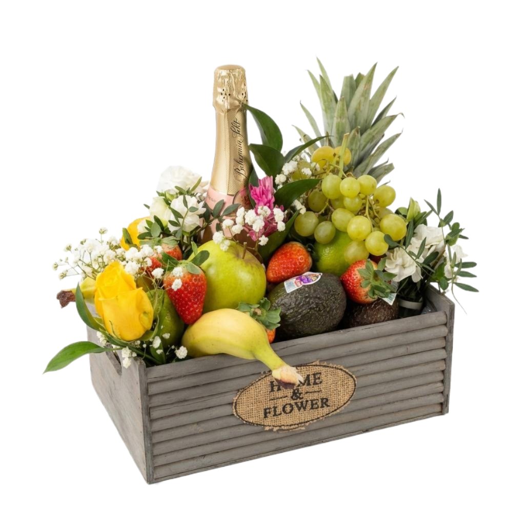 Bedýnka je plná čerstvého ovoce ,doplněná o Bohemia sekt a květiny.