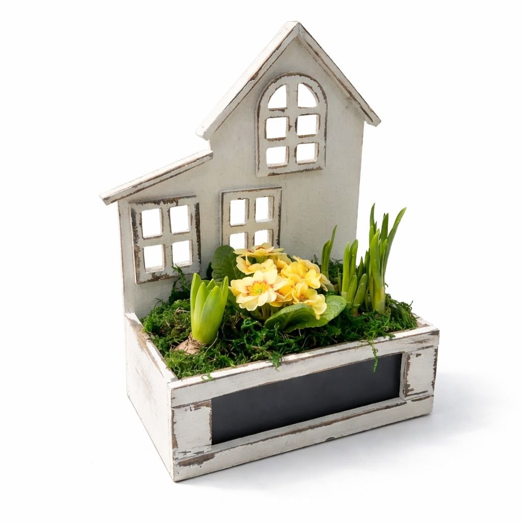 Toto originální jarní aranžmá v dekorativním domečku je krásnou kombinací přírodních materiálů a svěžích jarních květů. Živé jarní rostliny, jako jsou hyacinty a primule, jsou zasazeny do přírodního mechu a doplněny stylovým dřevěným domečkem v jemném vintage provedení. Celé aranžmá působí útulně, harmonicky a dokonale navodí jarní atmosféru.