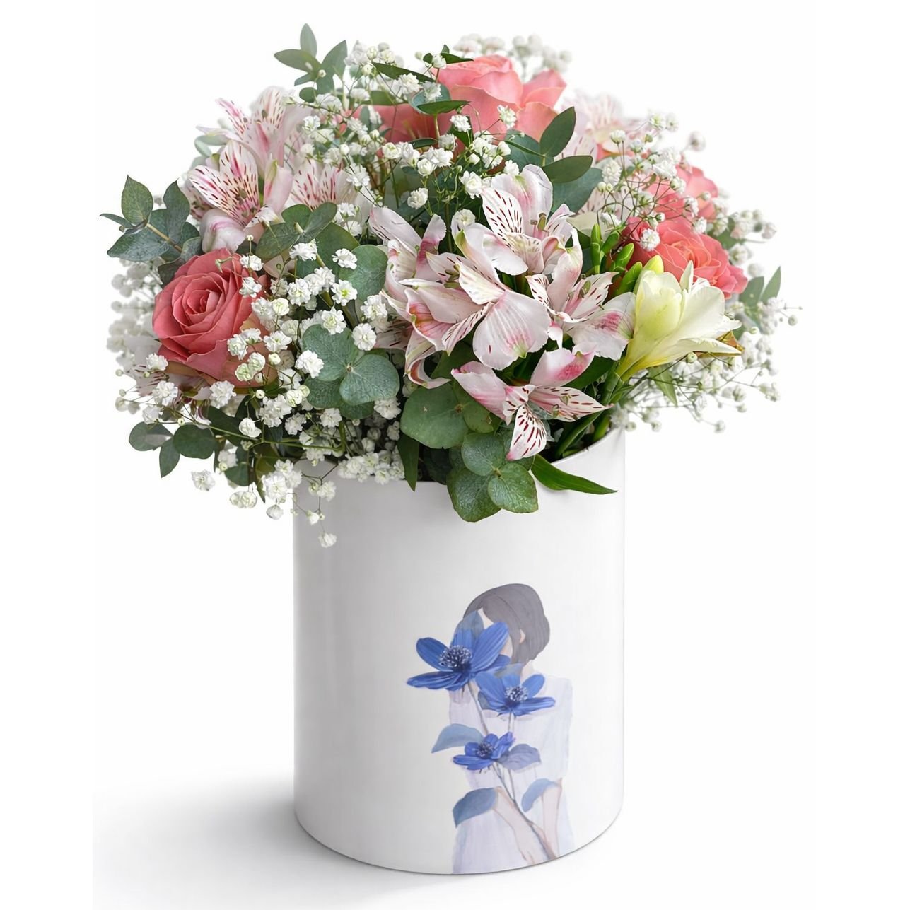 Tento štýlový kvetinový box spája jemné pastelové farby s precíznym floristickým spracovaním. Ruže, alstromérie, gypsophila, eukalyptus a jemná frézia vytvárajú ľahkú a harmonickú kompozíciu.